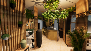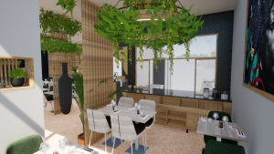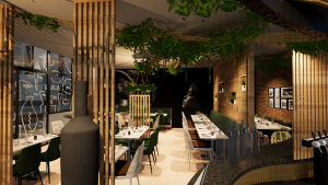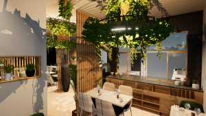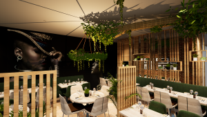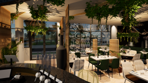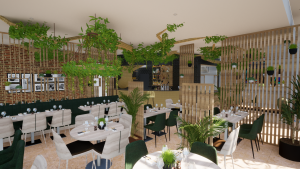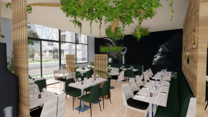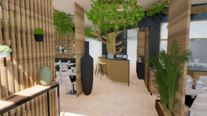 Le coeur du projet, se situe au niveau du bar, avec la création d’un arbre, dont l’ensemble des branches se déploie au sein du restaurant, sur lequel se découle l’ensemble du travail de lumière. Le reste de l’ameublement a été choisi en lien avec cette création, tout en bois et en chaleur, sans oublier la végétation.