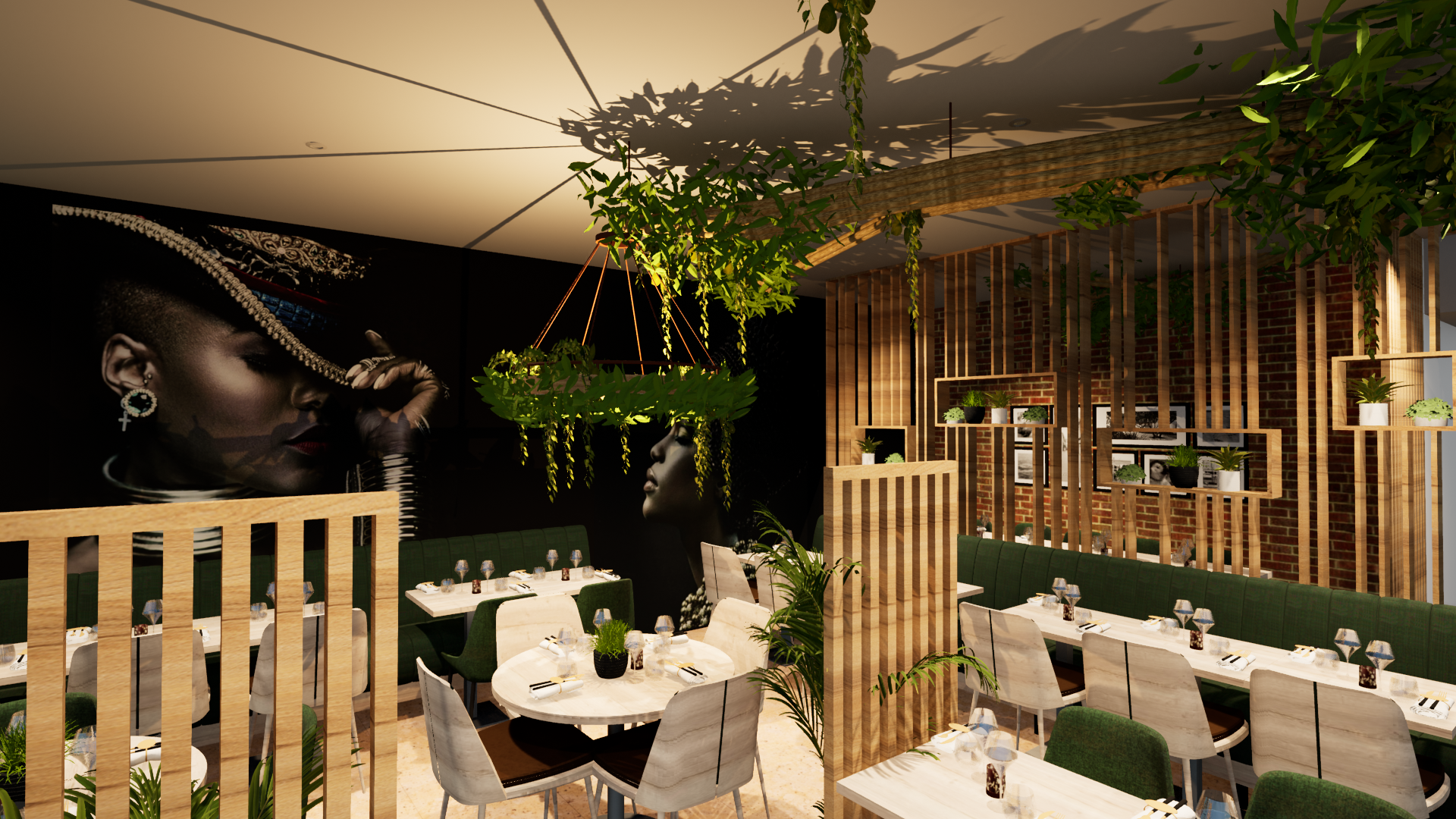 Situé dans une zone commerciale neuve de la région parisienne, ce restaurant a été imaginé dans une ambiance moderne avec une touche africaine, comme souhaité par ses propriétaires.